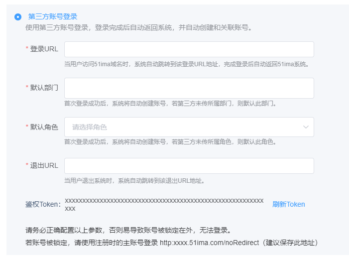 1)请使用主账号登录得助后台,进入SSO配置页面,路径:设置-->系统对接-->第三方账号登录,填写相关的SSO配置。如下图: