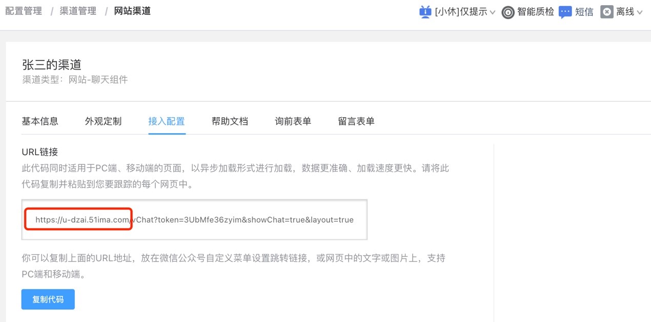 平台是采用动态域名每个租户不一致,获取方式:【配置管理】-【渠道管理】-【接入配置】下URL链接中框选部分;