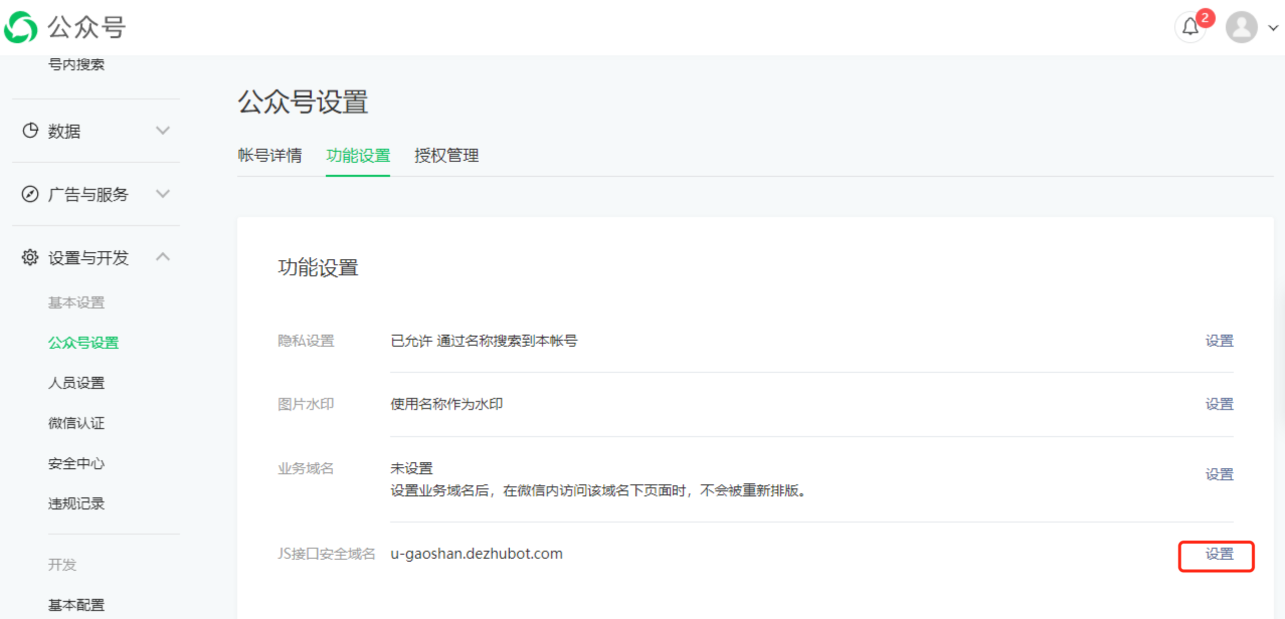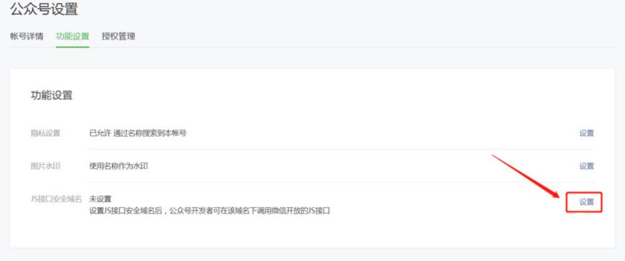 b、登录微信公众平台(https://mp.weixin.qq.com)进入“公众号设置”的【功能设置】里填写“JS接口安全域名”,如下图所示: