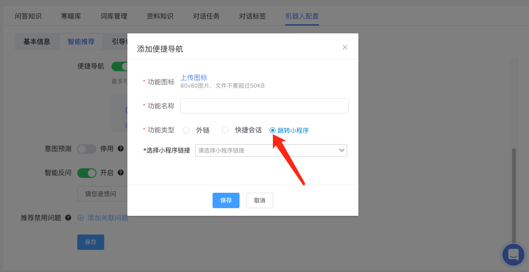 便捷导航:选择【跳转小程序】后根据提示选择素材管理中添加的链接名称