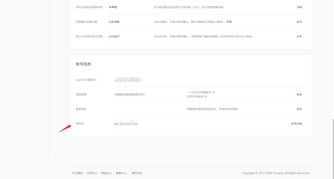 username在小程序里面就是指原始id,可以在小程序开发管理页面的菜单栏设置->基本设置,拉到最底下可以找到。